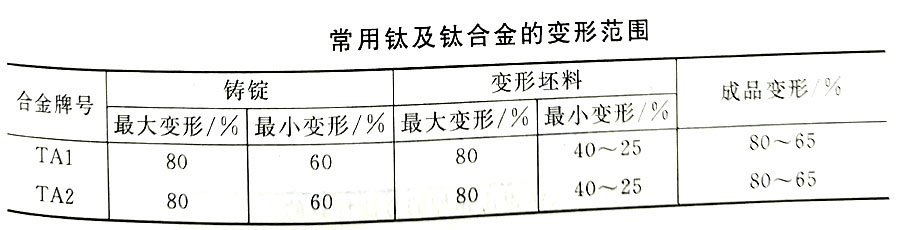 實(shí)踐證明:鑄錠的總變形量達(dá)70%~80%(即鍛造比達(dá)3.5 5)時(shí),在規(guī)定的變形溫度內(nèi)用合適的變形速度鍛造,其粗大的鑄 造組織基本上被破碎,得到較均勻、細(xì)小的纖維組織,其抗拉強(qiáng)度 和塑性指標(biāo)都有所提高。但為了獲得更好的性能,仍需進(jìn)一步鍛造 加工。鑄錠開坯變形量過低時(shí),鑄態(tài)組織不能得到有效的破碎,性 能較差,也直接影響到進(jìn)一步加工的產(chǎn)品性能。表9-2列出了我國(guó) 常用鈦合金每加熱一次采用的比較合適的變形范圍。