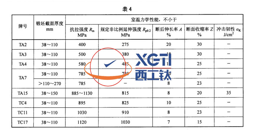 3.4.2 棒材的室溫力學(xué)性能應(yīng)符合表3的規(guī)定,鍛坯的室溫力學(xué)性能應(yīng)符合表4的規(guī)定,超出表中規(guī)格范圍的棒材或鍛坯的室溫力學(xué)性能由雙方協(xié)商確定。