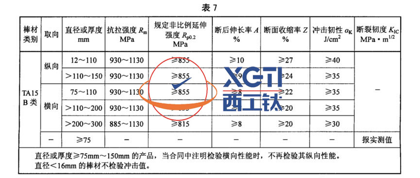 3.4.4 B類用途的TA15鈦合金棒材,其室溫力學(xué)性能在退火態(tài)棒材上或經(jīng)熱處理后的棒坯(一段棒材)上取樣測(cè)試。其室溫力學(xué)性能應(yīng)符合表7的規(guī)定,高溫力學(xué)性能應(yīng)符合表8的規(guī)定;當(dāng)訂購(gòu)方要求并在合同中注明時(shí),直徑大于200mm的棒材應(yīng)取樣鐓制餅坯,餅坯的室溫力學(xué)性能應(yīng)符合表9的規(guī)定。